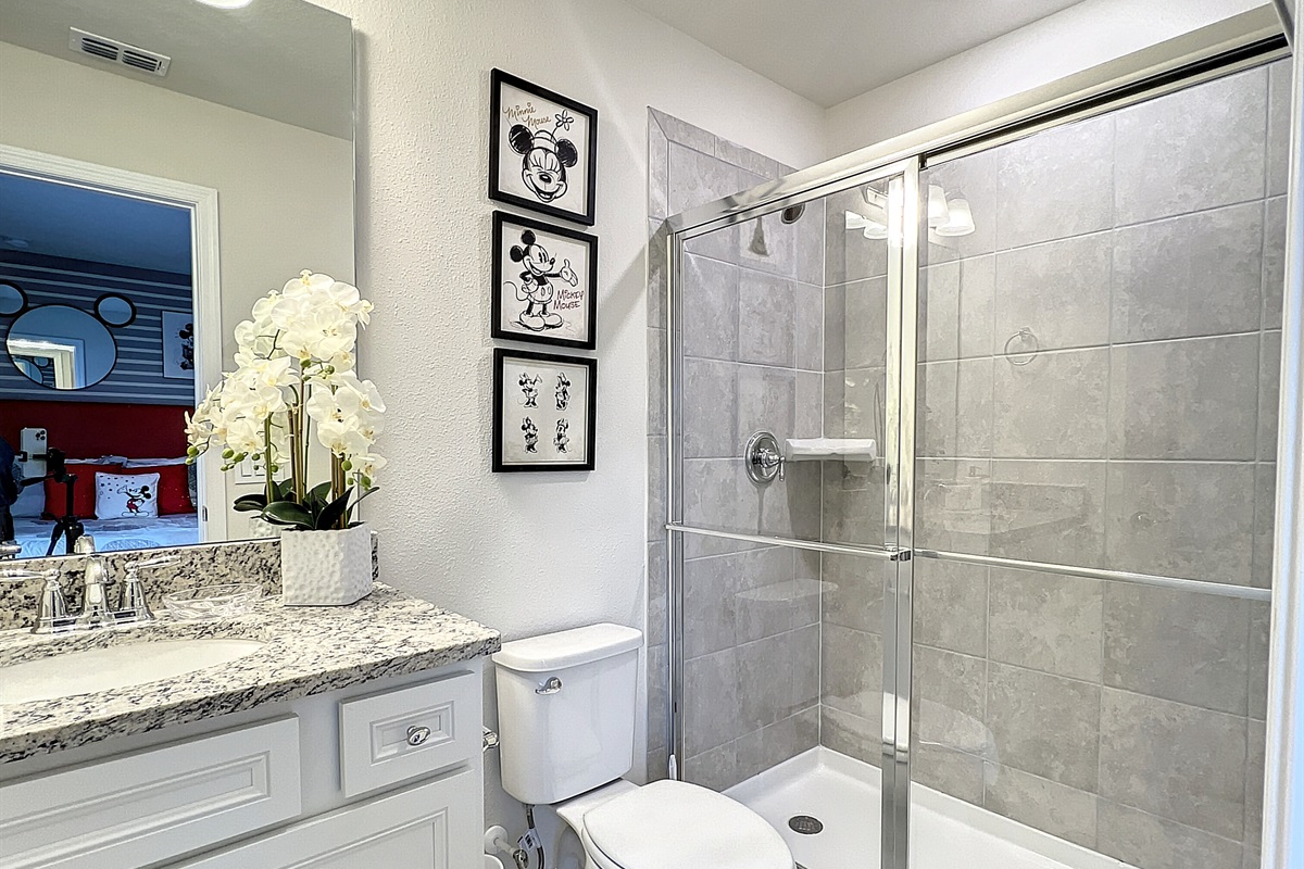 The open floor plan with kitchen, dining area and living room is perfect for your whole family to spend time together making memories, while still having plenty of room to spread out. Every room has an ensuite bath, so no one has to compromise on who gets the best room. The main floor master has a huge soaker tub, walk in shower and double vanity as well as large patios doors that lead directly out to the private pool and spa. The spacious master suite upstairs has a walk in shower, double vanity and huge walk in closet. Kids of all ages will want to stay in the Mickey Mouse themed twin/double room with adorable Mickey touches. An additional king room and twin/double room are upstairs.