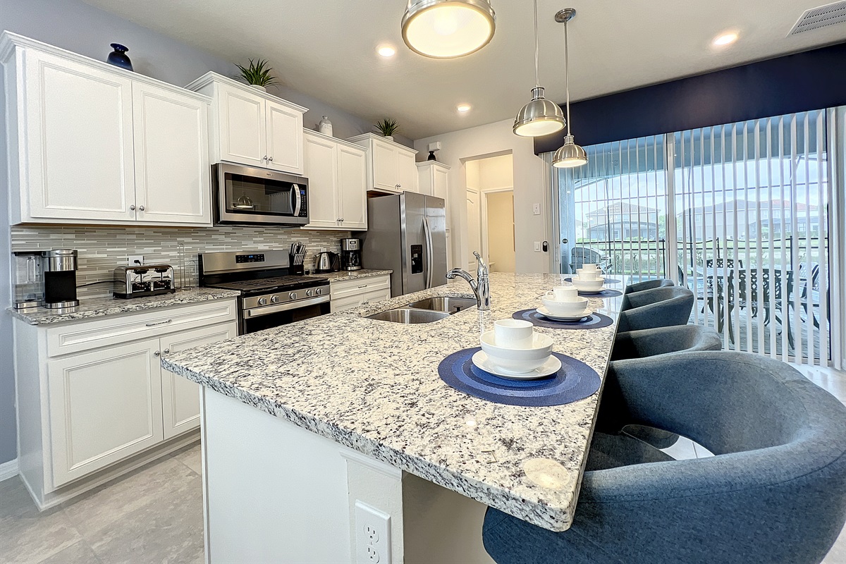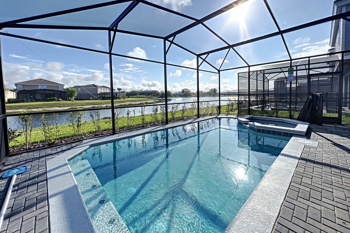Enjoy the amazing Florida sun in the covered backyard with pool, spa and fully furnished with seating and dining areas.