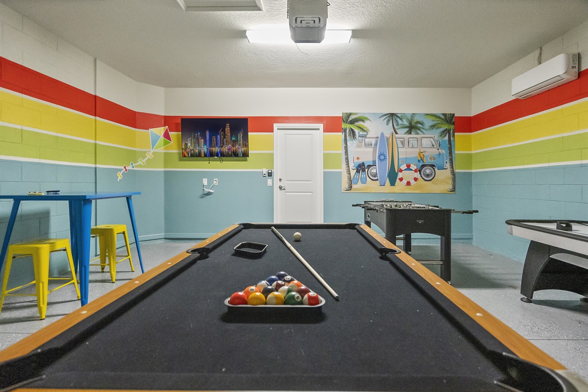 The garage has been transformed into a game room with smart TV, pool table, foosball, air hockey for your enjoyment.